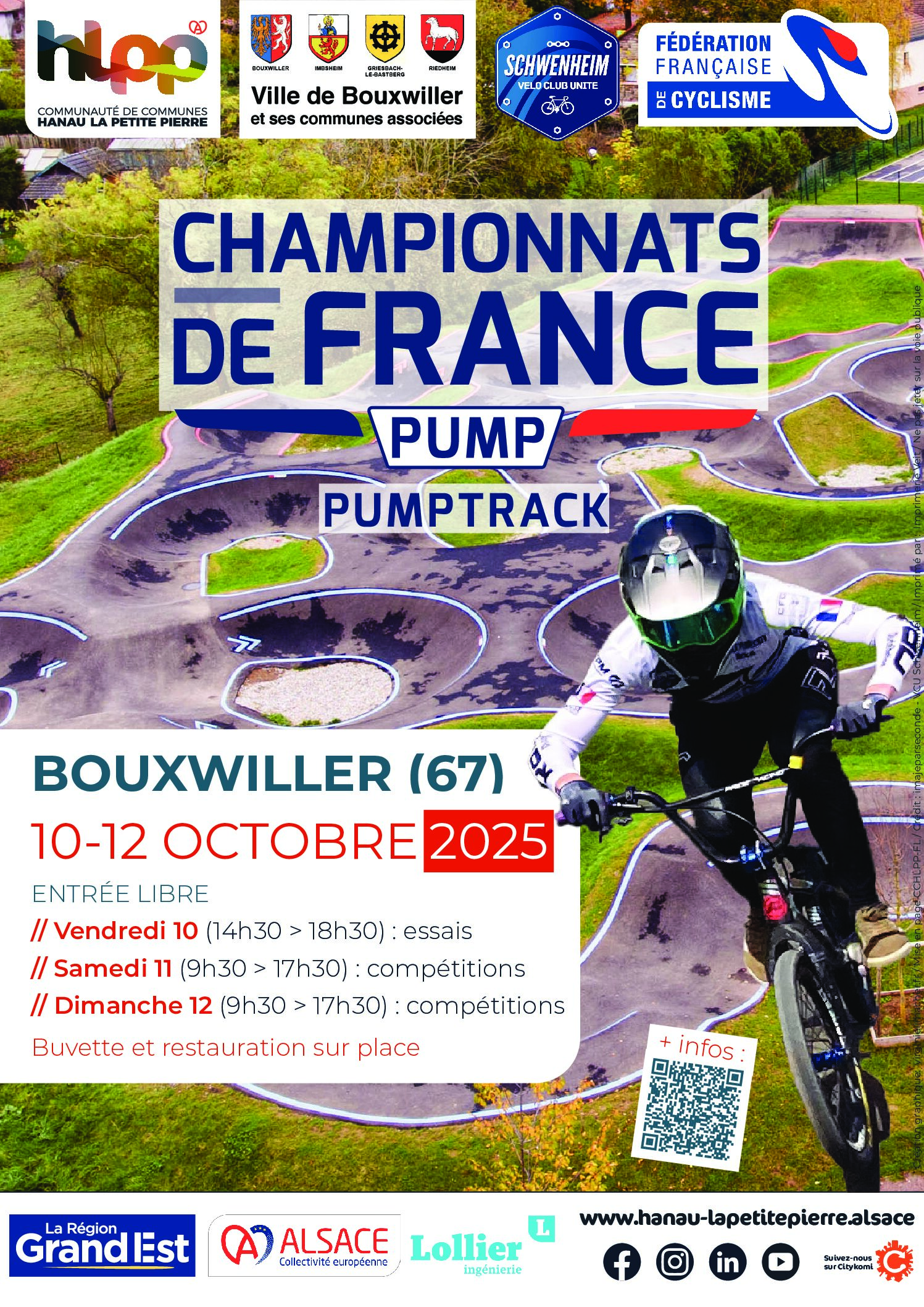 Championnats de France de pumptrack qui se dérouleront à Bouxwiller les 10, 11 et 12 octobre.