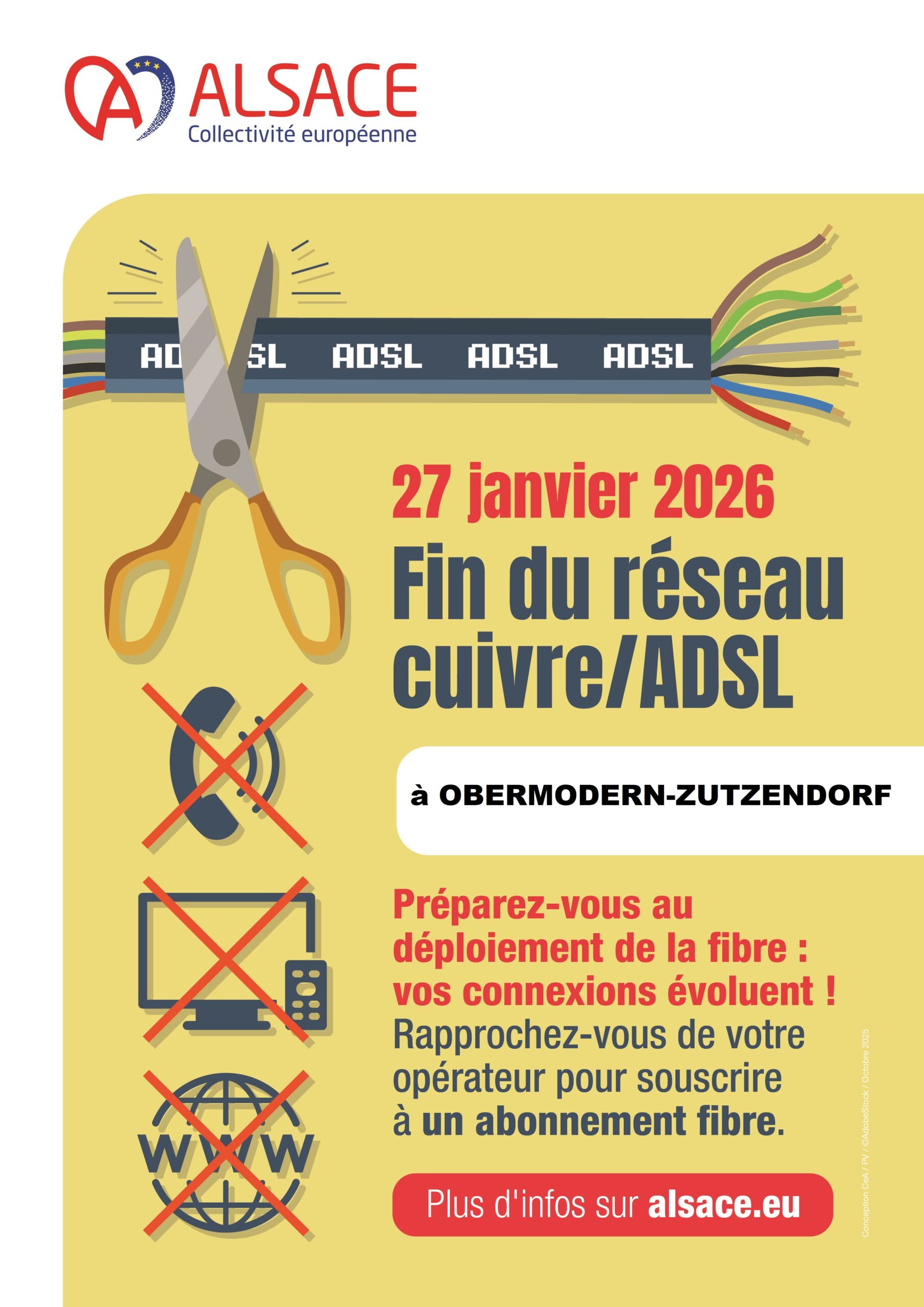 Dès le 27 janvier 2026 le réseau cuivre historique, support de la téléphonie fixe et de l’ADSL, sera fermé à OBERMODERN-ZUTZENDORF et remplacé majoritairement par la fibre optique.