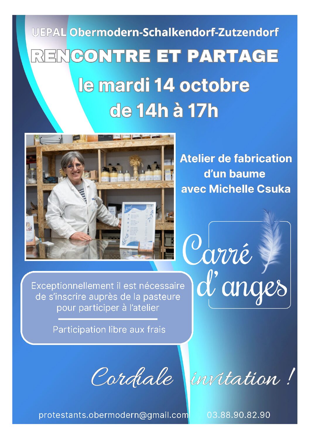 La Paroisse Protestante d’Obermodern Schalkendorf Zutzendorf organise une « Rencontre et Partage » avec Michelle Csuka où vous aurez l’occasion de fabriquer un baume.